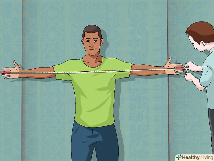 Витягніть руки в сторони якомога ширше. не згинайте ні руки, ні пальці. Тримайте їх рівно і прямо. Якщо ви будете піднімати або опускати руки, виміряний розмах рук буде менше, ніж є насправді. [5]