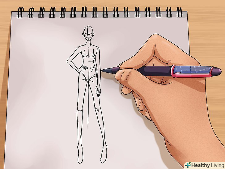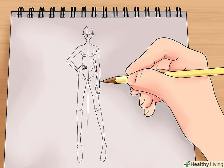 Намалюйте силует людини. моделюючи одяг, важливо думати про те, як той чи інший предмет одягу буде виглядати на людину. Саме тому більшість дизайнерів створюють свій ескіз, використовуючи силует людини. Це досить непростий і трудомісткий процес, тому щоб не малювати силует з нуля кожен раз, коли ви створюєте нову модель, багато дизайнерів використовують шаблон силуету людини. [11] це спрощує роботу, оскільки вам не потрібно буде кожен раз малювати силует, ви можете використовувати вже готовий. Почніть малювати силует людини простим олівцем.- Намалюйте силует, не переживаючи, що у вас вийде негарний начерк. Ваша мета полягає не в тому, щоб анатомічно правильно зобразити силует людини. Багато дизайнерів малюють силуети людини в якомусь своєму особистому стилі. Ваша модель буде виглядати ще більш унікальною, якщо ви зобразите її на силуеті, який намалювали самі. Не турбуйтеся про дрібні деталі; намалюйте двомірний силует.