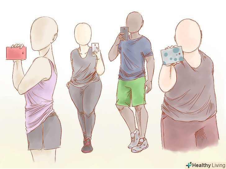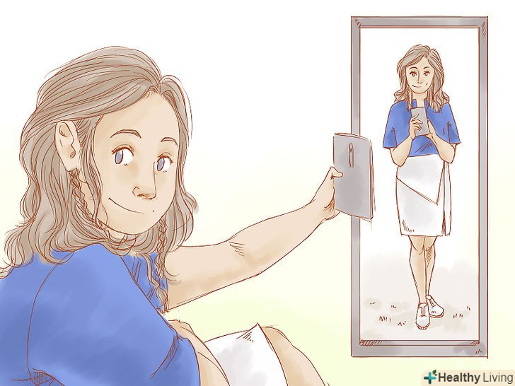 Зробіть знімок в повний зріст. якщо ви хочете продемонструвати ваш новий шикарний костюм, або ж фігуру після дієти, вам необхідно стати перед дзеркалом на повний зріст, для того, щоб камера змогла захопити ваше тіло з голови до ніг. В цьому випадку, ваше обличчя більше не є головним об'єктом фото.- Робіть знімки в повний зріст в прибраному приміщенні. Фото повинно акцентувати увагу на вашій фігурі, а не на зайвих предметах на задньому плані.