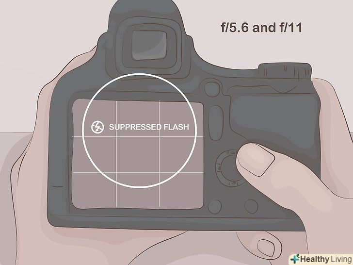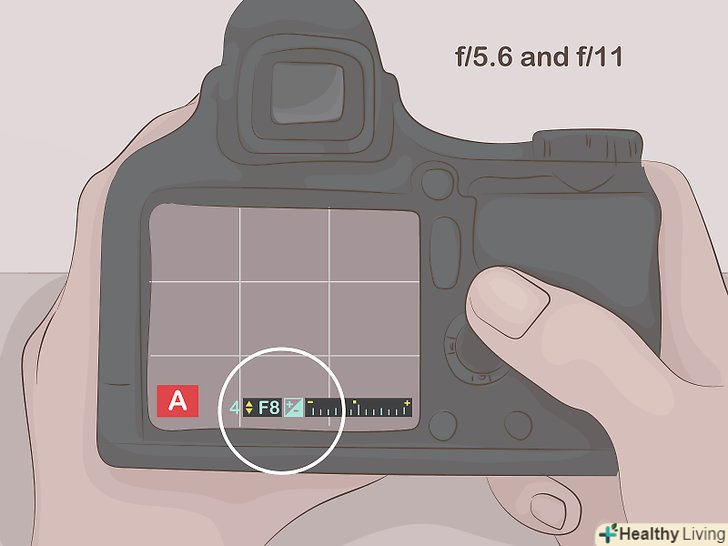 Зменшіть діафрагму фотокамери, щоб підвищити глибину різкості. знімки з близької відстані краще виглядають при гарній різкості. Зменшіть розмір діафрагми до значень f/5.6-f / 11. [12]- Конкретне значення діафрагми буде залежати від того, які саме деталі очі ви хочете підкреслити на своїй фотографії. Поекспериментуйте з діафрагмою, щоб подивитися, яким чином різні настройки впливають на кадр.