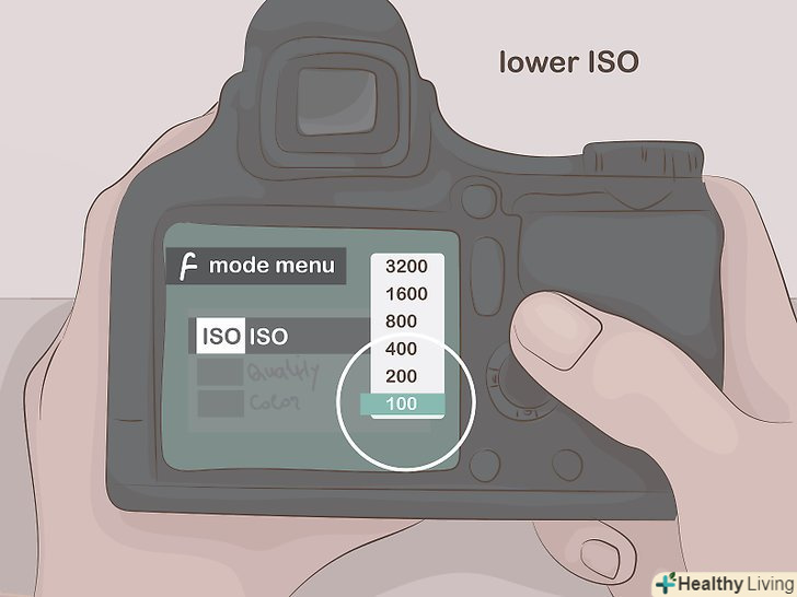 Зменшіть значення ISO, щоб уникнути появи зернистості цифрового зображення. збільшення ISO дозволяє робити фотознімки при поганій освітленості об'єктів, але при цьому фотографії стають зернистими. Якщо ви займаєтеся фотозйомкою при хорошому освітленні, тримайте значення ISO на найнижчому допустимому рівні. [14]