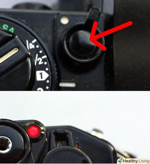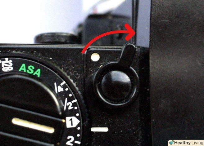 Увімкніть екран видошукача. для цього є невеликий перемикач біля великого колеса ASA на задній панелі камери з її лівого боку. Поверніть перемикач за годинниковою стрілкою. Коли ви побачите білу точку, це означатиме, що екран видошукача увімкнено.