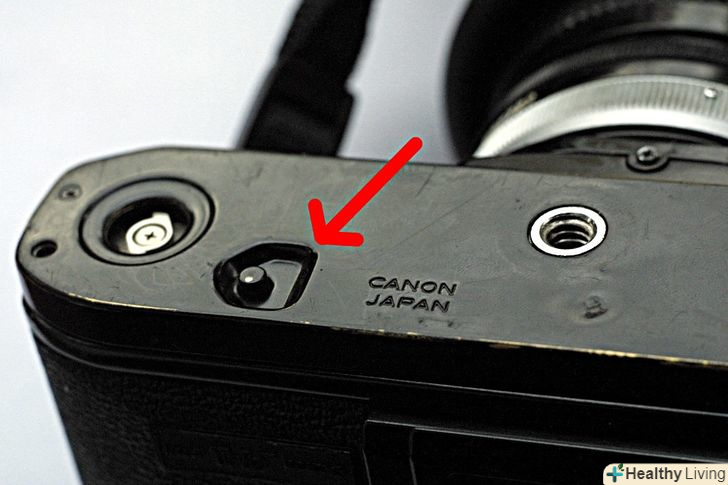 Перевірте стан батареї. A-1 управляється електронікою, тому камера не буде працювати, якщо батарея сідає або вже розрядилася (затвор не буде спрацьовувати). Натисніть кнопку перевірки батареї, як показано на зображенні. Якщо лампочка поруч з кнопкою спуску затвора не блимає, це означає, що батарея повністю розряджена. Якщо лампочка швидко блимає (кілька разів на секунду), батарею потрібно замінити. Поставте в камеру будь-які недорогі батарейки 4lr44 (або A544).- Вставте плівку. цей процес нічим не відрізняється від аналогічного процесу в інших плівкових дзеркальних камерах.