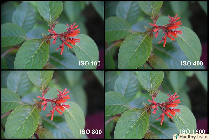 Зрозумійте, для чого потрібно змінювати значення ISO. у цифровій камері настройку ISO змінюють, щоб регулювати світлочутливість. При яскравому світлі використовуйте низьке значення чутливості, щоб на зображенні було менше шуму, оскільки при ISO 100 витримка буде досить короткою. При тьмяному освітленні, коли навколишнього світла не вистачає, вам знадобиться підвищити світлочутливість. Тому підніміть значення ISO з 100 до 1600 або навіть до 6400, якщо це необхідно і параметри камери дозволяють, щоб впустити достатньо світла і зображення не було змазаним. Однак якою ціною ви цього досягнете? Збільшуючи ISO, ви тим самим збільшуєте шум (в плівковій фотографії — зернистість) і знижуєте кольоровість. Тому намагайтеся встановити ISO якомога нижче, але не занизити його до такої міри, щоб знімок вийшов змазаним.