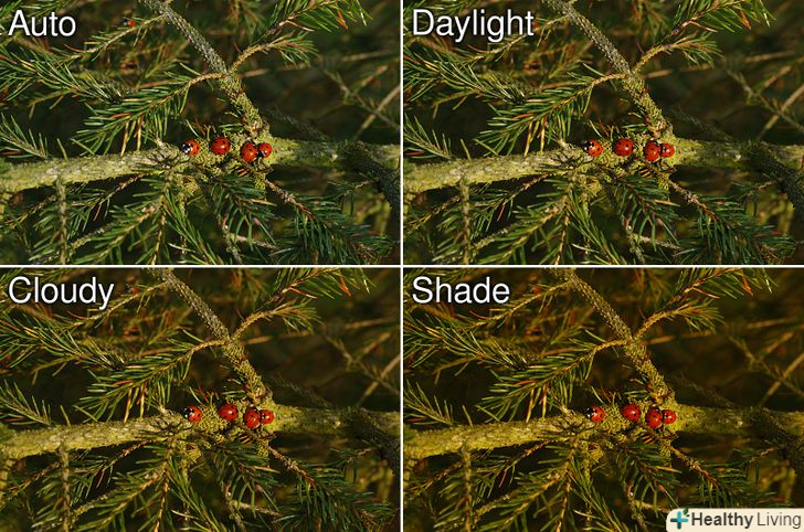 В умовах природного освітлення познімайте з автоматичним налаштуванням балансу білого і в режимах "Денне світло", "хмарно" і "тінь". на більшості знімків в автоматичному режимі тони будуть занадто холодними, і зображення вийде набагато більш вдалим при використанні інших налаштувань. Якість зображення буде залежати від фотоапарата; в деяких камерах (особливо в камерах телефонів) алгоритми передачі балансу білого в деяких умовах освітленості просто жахливі.