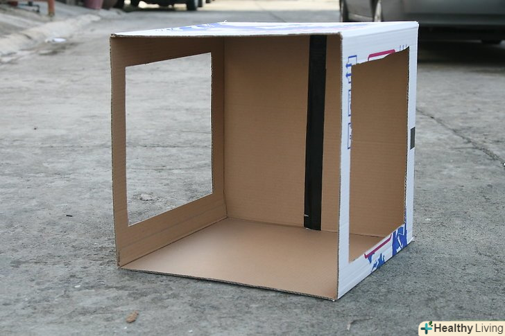 - Поверніть коробку і обклейте папером. поверніть коробку так, щоб вирізана сторона була спрямована на стелю, а верх коробки - в вашу сторону. Це правильне положення вашого лайтбоксу. Покладіть аркуші паперу для принтера таким чином, щоб вони перекривали краю вирізаного отвору і закріпіть їх за допомогою скотча. Внутрішня частина коробки повинна бути повністю білою.