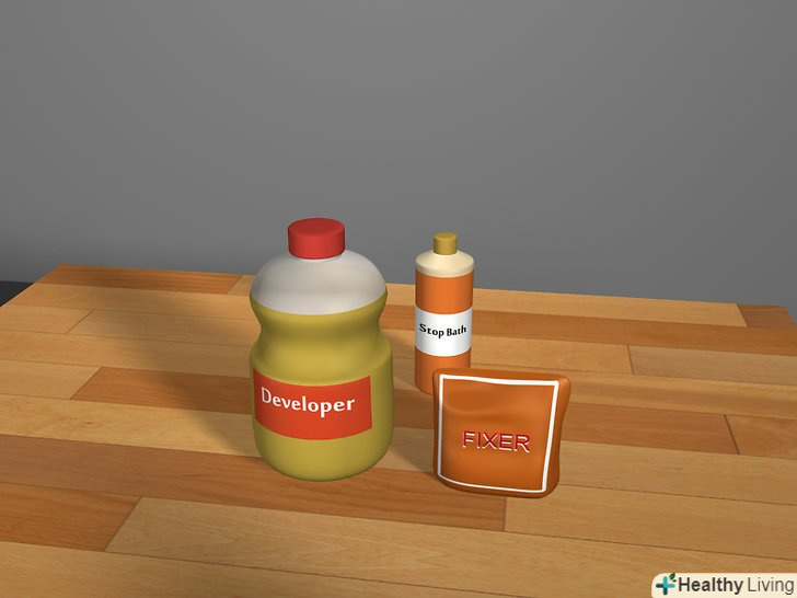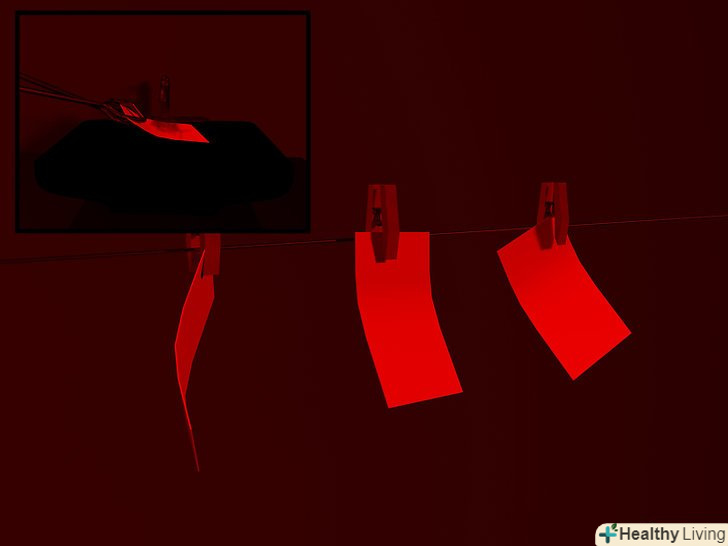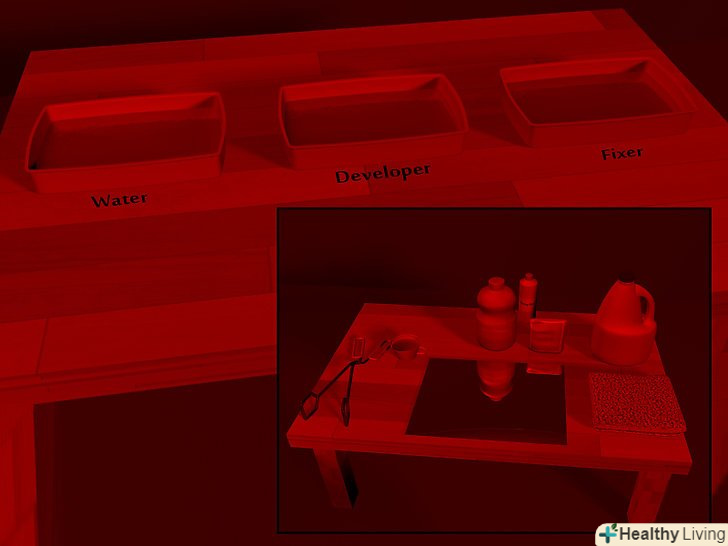 Зберіть необхідні матеріали. крім темної кімнати вам знадобляться також розчин для прояву, розчин для закріплення, вода, щипці, рушники, лист скла і червоне освітлення. Крім джерела червоного світла кімната повинна бути повністю чорною.- Ви також можете використовувати помаранчеву або червону новорічну підсвічування.