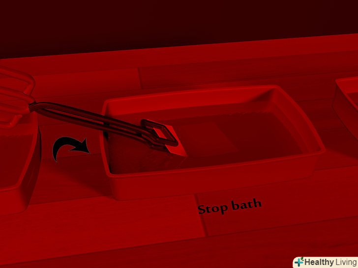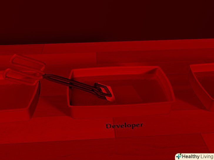 Помістіть Фотопапір в ванночку з проявником. після того, як ви перенесли негатив на фотопапір, помістіть його в проявник використовуючи щипці. Спостерігайте за тим, як зображення проявляється на папері. Як тільки його лють вас влаштувала-витягуйте.- М'яко похитуйте ванночку, щоб розчин добре розподілився по папері.