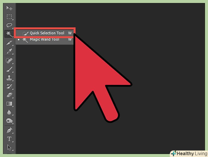 Використовуйте інструмент Quick Selection (Швидке виділення), щоб розмити фон. знайдіть його зліва на панелі інструментів – він позначений пензликом і пунктирним овалом поруч з нею.- Виділіть область, яка повинна залишатися у фокусі. Цей інструмент розрізняє межі, за якими можна виділити частину зображення, і його буде набагато простіше використовувати, якщо ви зуміли хоча б злегка розмити фон в процесі зйомки.