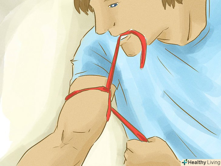 Накладіть на руку джгут. використання джгутів збільшує тиск у венах, через це вони здуваються і стають більш помітні під шкірою. [16] Зав'яжіть що-небудь навколо тієї ділянки, на якому повинні роздутися вени, але несильно.- Ще один спосіб — сильно стиснути зап'ясті лівої руки правою рукою (або навпаки).
