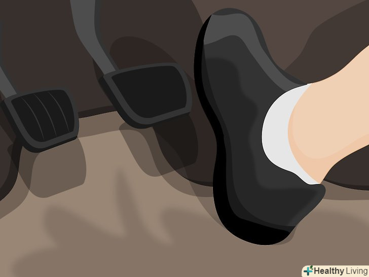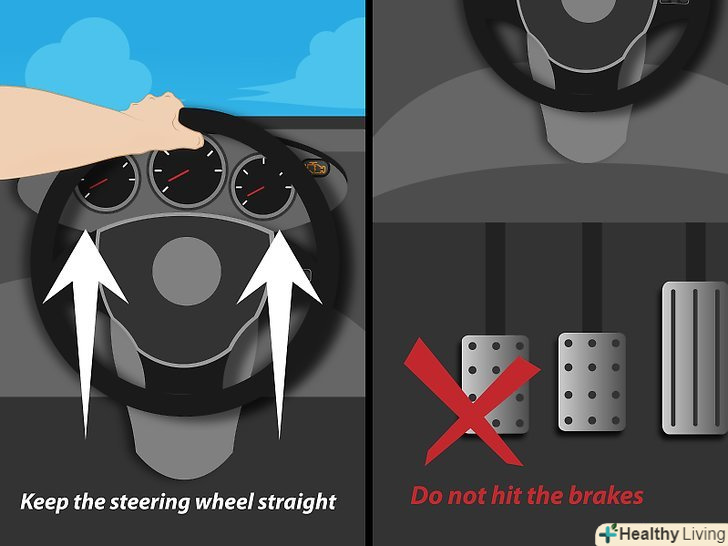 Загальмуйте, не натискаючи на педаль гальма.приберіть ногу з педалі гальма, і не міняйте положення керма.[5]Таким чином ви зможете краще контролювати машину і уникнути зайвих пошкоджень.- Не тисніть на гальмо. В іншому випадку вас, швидше за все, занесе. Сенс в тому, щоб просто проїхати ділянку з ожеледицею, не втрачаючи управління. Зазвичай він не довше 6 метрів.