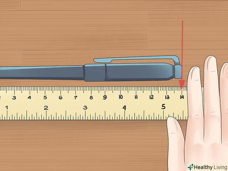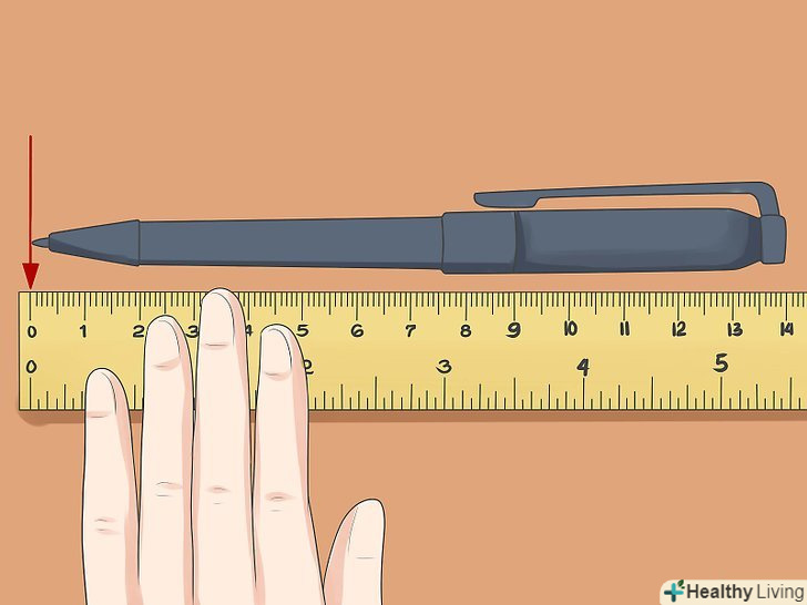 Вирівняйте нульову позначку на лінійці з краєм вашого об'єкта. зазвичай вона знаходиться зліва. [12]- Не забудьте вирівняти кінець лінійки з об'єктом.