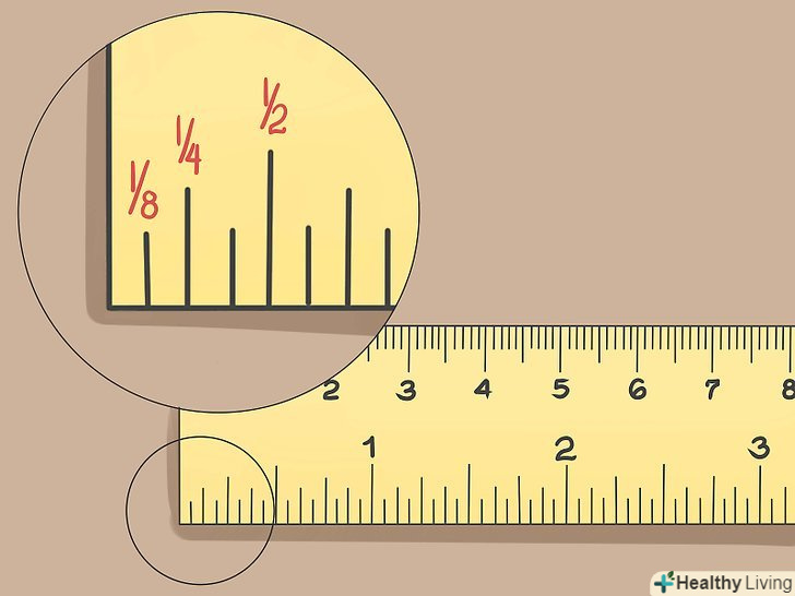 Знайдіть позначки дрібних часток від дюйма. вони визначають межі різних часток дюйма, щоб допомогти вам робити вимірювання якомога точніше. [8]- Найкоротші ділення між дюймовими відмітками на лінійці позначають 1/16 частку дюйма.