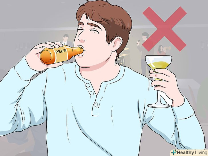 Не змішуйте напої. намагайтеся уникати змішування пива з іншими спиртними напоями, особливо якщо ви почали свій вечір з келиха пива. Крім того, не змішуйте інші алкогольні напої між собою, наприклад, горілку, ром і віскі. Замість цього зупиніть свій вибір на світлому або темному алкогольному напої, пиві або вині. [12]- Крім того, легкі (прозорі) алкогольні напої, такі як горілка і джин, набагато легше засвоюються організмом, ніж темні алкогольні напої, такі як віскі і бурбон.