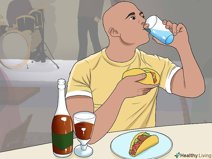 Пийте воду і їжте під час вживання алкогольних напоїв. це ще один спосіб зменшити вплив алкоголю на організм. Коли ви п'єте алкогольні напої, їжте легкі страви, такі як тако. Також не забувайте випивати склянку води між напоями. [13]- Наприклад, після того, як ви вип'єте перші два або три алкогольні напої, з'їжте тако і випийте склянку води, перш ніж продовжувати пити.