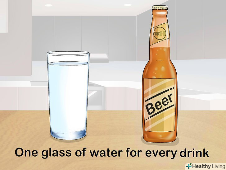 Пийте воду. попросіть бармена налити вам води або скористайтеся більш зручним для вас способом пити воду. Рекомендується після кожної склянки алкоголю випивати склянку чистої води. Тому якщо ви вживаєте чотири порції алкогольного напою, пам'ятайте, що вам знадобиться чотири склянки води. [2]- Крім того, перед сном випийте ще один стакан води. Алкоголь має зневоднюючий ефект, тому дуже важливо компенсувати втрату рідини великою кількістю води. Додайте невелику щіпку солі в воду для відновлення водно-сольового балансу. [3]