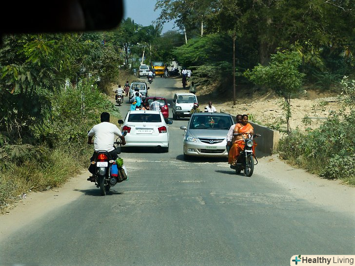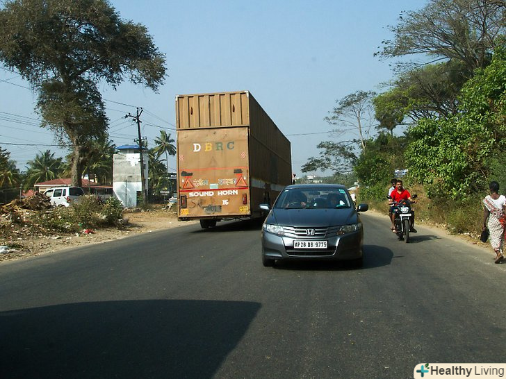 У більшості місць в Індії на комерційному транспорті (Вантажівки, Автобуси) важить знак «Посигнальте». це означає, що якщо ви посигналите їм, вони поступляться вам дорогу. Посигнальте один раз і зробіть це коректно. Якщо вони не згортають, продовжуйте їхати за ними. Хоча вони і поступаються вам дорогу, перш ніж перебудовуватися, переконайтеся, що назустріч вам не їдуть автомобілі, які можуть перешкодити вам зробити маневр.- Коли будете сигналити, спочатку переконайтеся, що це можна робити в цій зоні (наприклад, це заборонено поруч з госпіталем). В іншому випадку ви можете отримати штраф і порушити спокій пацієнтів госпіталю.