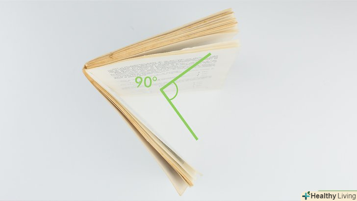 Розкрийте книгу, поставивши її під кутом 90 градусів. поставте книгу під кутом 90 градусів, щоб потік повітря міг обдувати сторінки. Постарайтеся поставити книгу таким чином, щоб її сторінки були максимально відокремлені один від одного. Завдяки цьому потік повітря, що виходить з тепловентилятора, швидше висушить мокрі сторінки. [6]- Будьте обережні, не намагайтеся відокремити вологі сторінки один від одного. В іншому випадку ви можете порвати їх або фарба віддрукується на іншій сторінці.