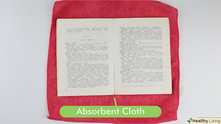 - Промокніть кожну сторінку чистим білим рушником. використовуючи чисту білу тканинну або паперову серветку, промокніть кожну сторінку книги. Не тріть сторінки, так як вони можуть порватися. Обережно промокнувши одну сторінку, переходите до наступної. [2]
