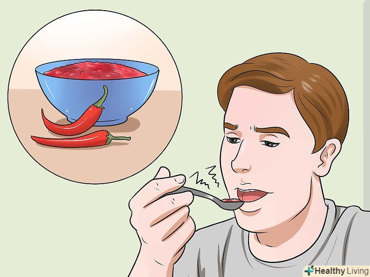 З'їжте дуже гостру їжу. звичайно, вам знадобиться сміливість, щоб з'їсти щось гостре. Однак змусьте себе з'їсти невелику кількість гострого продукту. Ви відчуєте печіння в горлі, крім того, у вас може з'явитися нежить. Коли ваші батьки побачать, що ви сопіть носом і скаржитеся на те, що у вас болить горло, вони, ймовірно, подумають, що ви захворіли.- Якщо від гострої їжі у вас починається печія, ви насправді можете відчути біль в горлі через закидання кислоти. [2]