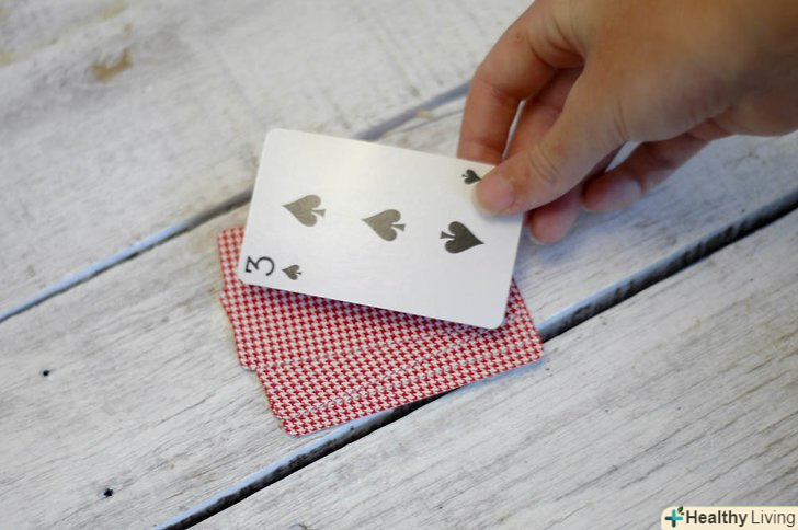 - Притримуючи колоду середнім і вказівним пальцем, переведіть руку вниз. Якщо ви зумієте зробити це природно, ваша форсируемая карта непомітно виявиться на одному рівні з іншими картами колоди.