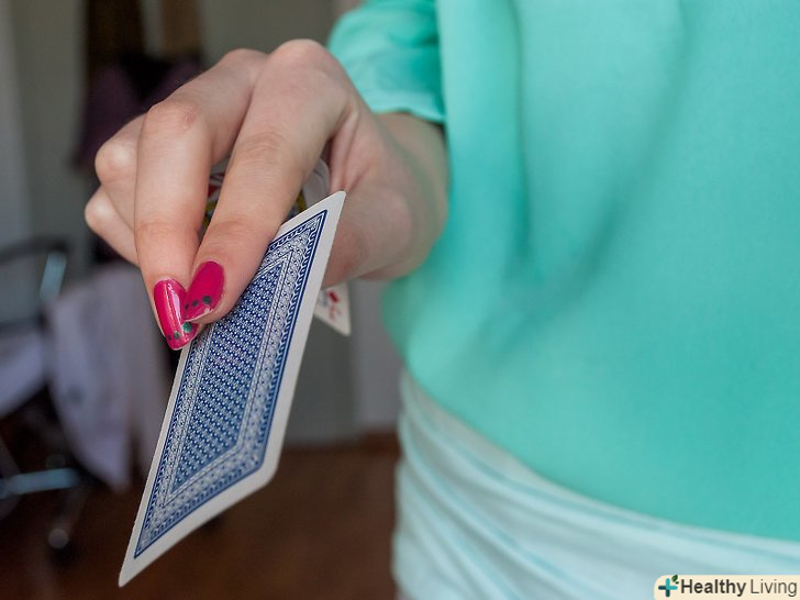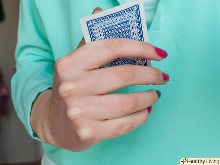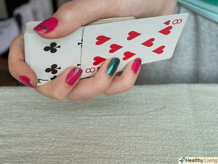 - Переконайтеся в тому, що ви міцно тримаєте низ колоди лівою рукою, але при цьому так само переконайтеся, що є місце для того, щоб карти ковзали навколо ваших пальців.