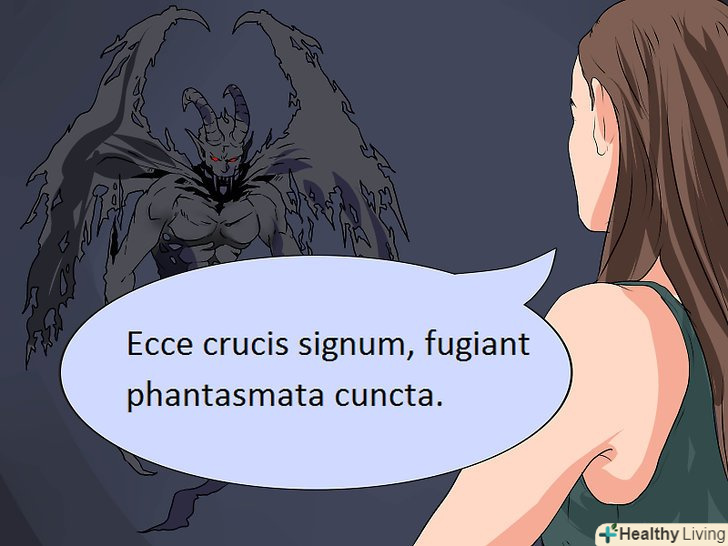 Твердо попросіть духа піти. не зліться і не бійтеся. Найчастіше духів проганяють саме так. Прохання піти треба повторювати багаторазово, особливо під час очищення будинку. Важливо не відчувати злості і страху з двох причин: ви будете спокійніше (що зробить процес очищення більш ефективним), і дух відчує, що ви не уявляєте для нього загрози.- Спробуйте вимовити наступну латинську фразу: "Ecce crucis signum, fugiant phantasmata cuncta" (перекладається як "побачте образ Хреста; всі привиди підіть".) [5]