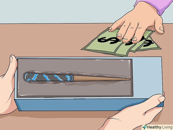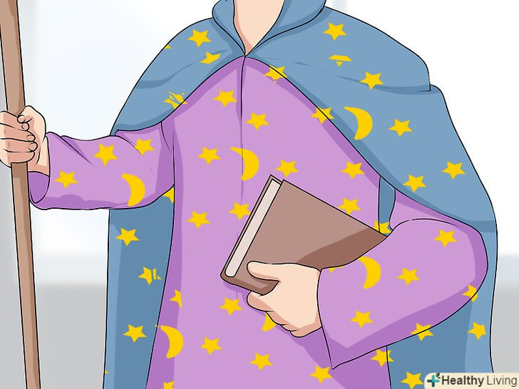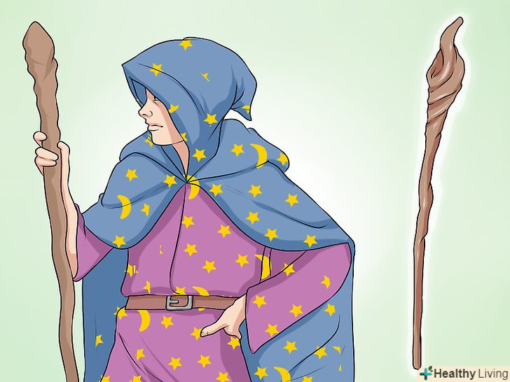 Купіть або зробіть чарівну паличку. у всіх магів є чарівні палички. Практично у всіх магазинах маскарадних костюмів продаються" чарівні " палички за розумною ціною. Також можна знайти таку паличку в магазині іграшок, особливо якщо там продаються товари за франшизами типу Гаррі Поттера. Якщо ж ви не знайшли підходящу паличку в магазині, завжди можна зробити її самостійно. [8]- Для того, щоб зробити паличку, можна використовувати пухнасту гнучку дріт для виробів. Просто скручуйте разом кілька таких дротів, поки у вас не вийде міцна і досить товста паличка. Потім прикріпіть якусь фігуру з кольорового картону до кінця палички (добре підійде щось типу зірки або магічної сфери). [9]