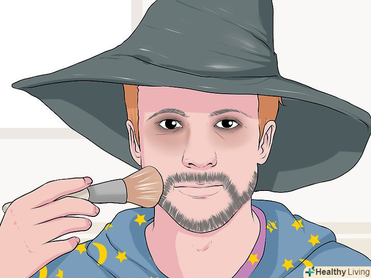 Освітлити волосся на обличчі. якщо у вас є вуса і (або) борода, потрібно висвітлити і їх: так вони будуть виглядати як сиві, а ви станете старим і мудрим чарівником. [13]- За допомогою пензлика для макіяжу, нанесіть на бороду білий грим.