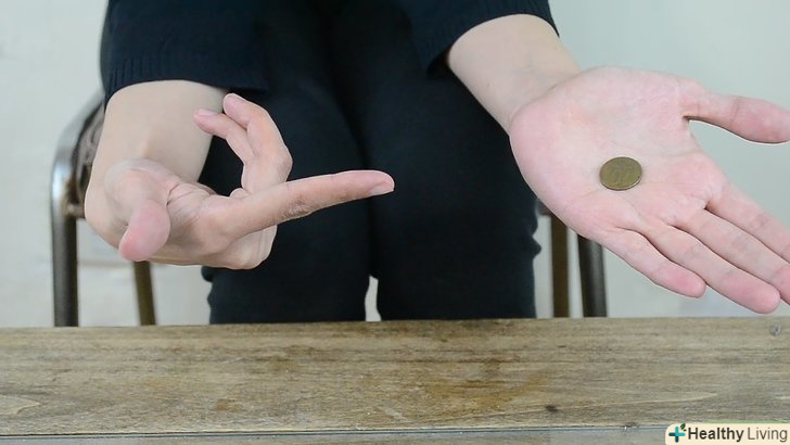 - Підберіть п'ятирублеву монету тією рукою, яка підпирала ваш підборіддя. Тим не менш цього не повинні помітити глядачі . Це можна зробити одним з двох способів, які вказані нижче.