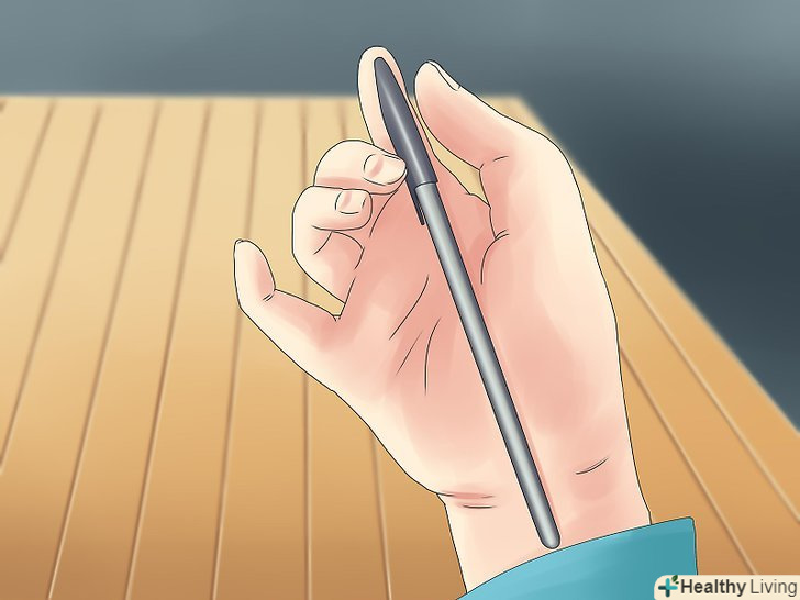 Візьміть ручку двома руками. візьміться за два кінці ручки вказівними і великими пальцями. Пальці повинні бути звернені до глядачів. Середнім пальцем домінантної руки натисніть на ручку, немов намагаючись втиснути її в долоню.- Слід тримати ручку перед собою на відстані 30 сантиметрів. Лікті не повинні бути затиснуті і напружені.