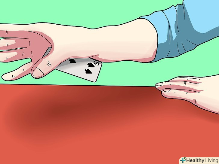 - М'яко стисніть пальці і витягніть руку. Карта буде затиснута між першим, другим, третім і четвертим пальцями і буде здаватися, що вона зникла. Тільки переконайтеся, що ви показуєте глядачам руку долонею вперед і вони не бачать карту з іншого боку руки.
