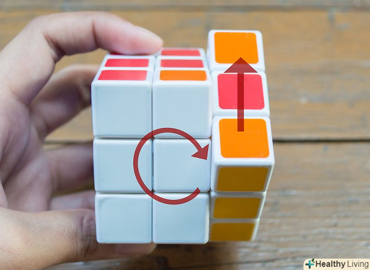 - Дивлячись на червону сторону кубика, поверніть праву його сторону на один поворот вперед. Коли ви це зробите, три червоні блоки кубика підуть вперед.