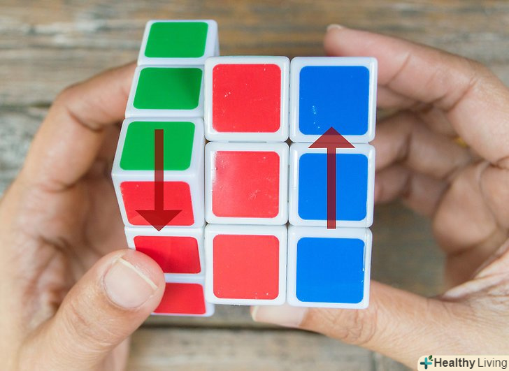 Проверніть протилежні сторони кубика в протилежному напрямку. Візьміть кубик в руки, щоб провернути кожну пару його сторін на один поворот в протилежному напрямку. Іншими словами, одна сторона повинна бути прокручена вперед, а інша-назад.- Поверніть кубик червоною стороною до себе.