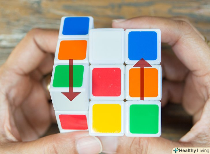 Проверніть верхню і нижню сторони кубика Рубіка. продовжуйте тримати кубик центральним зеленим блоком до себе. Проверніть верхівку кубика на 180 градусів (два повороти). Аналогічним чином проверніть нижню сторону. [5]