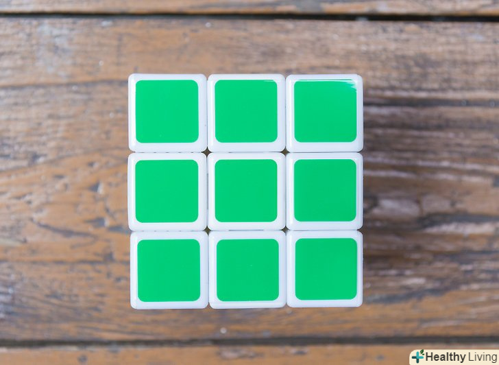 Виконайте завершальні повороти. продовжуючи утримувати кубик центральним зеленим блоком до себе, проверніть його передню сторону на 180 градусів (два повороти), як якщо б ви набирали номер на дисковому телефоні. Аналогічним чином проверніть на 180 градусів протилежну сторону. Тепер на всіх чотирьох сторонах кубика Рубіка повинен з'явитися шахових візерунок. [6]