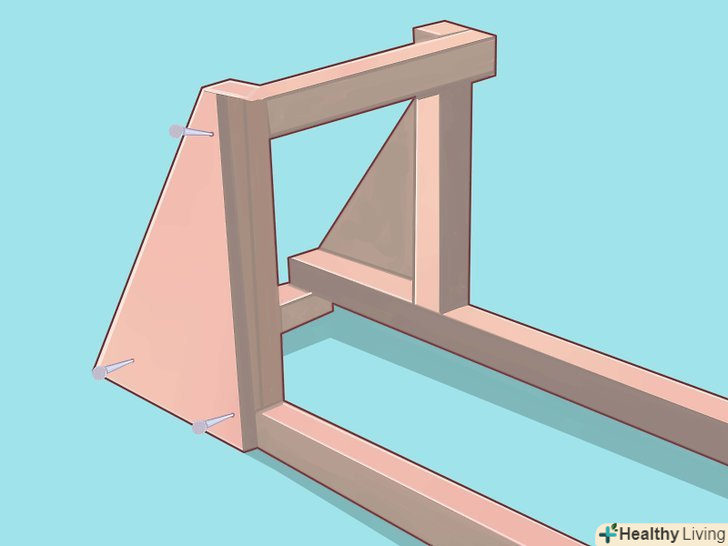 Приколотите опорні плити. Розпиляєте 38х47х1,3 см плиту навпіл по діагоналі. Приколотите кожну з одержаних половинок зовні до зроблених конструкцій так, щоб прямий кут трикутника збігався з прямим кутом, утвореним зовнішніми краями з'єднаних брусів.