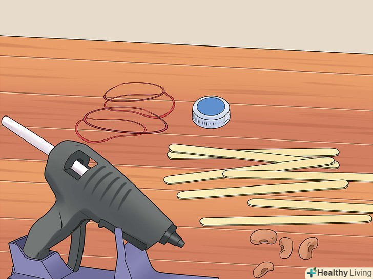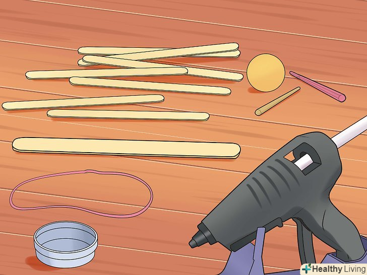 Зберіть ваші приналежності. ця стандартна катапульта використовує напругу, щоб кидати свій вантаж і може бути зроблена з пари простих предметів, які можуть бути куплені в дешевих ремісничих магазинах за 5 доларів. Ви вже можете мати пару речей десь у вашому домі! [2]- 7 конструкторських паличок. Ви можете використовувати як стандартні палички розміру 4.5, так і великі палички 6-го розміру для цього проекту.
