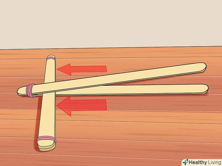 Зробіть 2 купки з паличок. це утворює корпус вашої катапульти. Покладіть 5 паличок і закріпіть купку гумкою по обох краях. Покладіть ще 2 і закріпіть тільки з одного кінця, залишивши другий кінець відкритим.