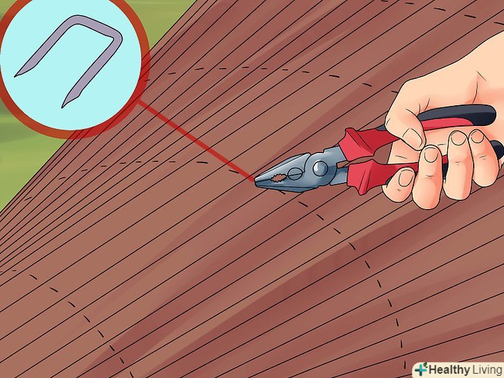 Витягніть скоби. Як тільки ви прикріпите всі дошки і клей висохне, акуратно витягніть Скоби з кінців і форм. Для цього використовуйте плоскогубці. [4]- Коли будете їх виймати, намагайтеся не зіпсувати дошки і не залишити вм'ятин, викручуючи скоби.