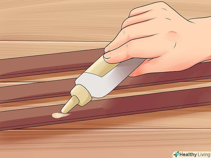 Змастіть краї дощок клеєм для дерева. у каное такого типу дошки приклеюються один до одного, що дозволяє їм тримати форму. До форм і кінців дошки кріпляться за допомогою скоб, а форму вони тримають внаслідок склеювання один з одним.- Коли ви будете змащувати краю дощок клеєм, надіньте рукавички.