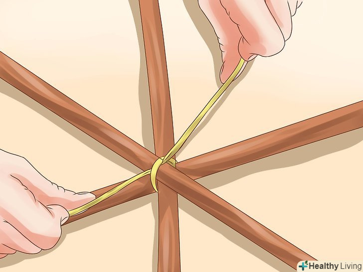Попросіть друга допомогти вам з установкою вігвама. поодинці підняти вігвам досить непросто, тому попросіть про допомогу друга або батьків. Після установки вігвам повинен нагадувати триногу для камери. Розташуйте жердини так, щоб споруда була стійко.- Після установки Триноги розмістіть залишилися жердини навколо її центру. Рештою вільним кінцем мотузки зв'яжіть їх разом, або перев'яжіть гумовими стрічками.