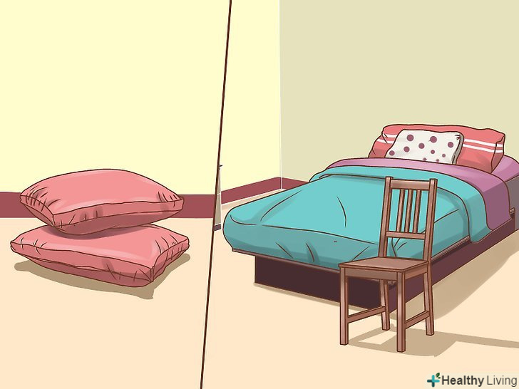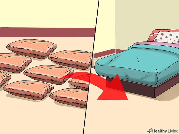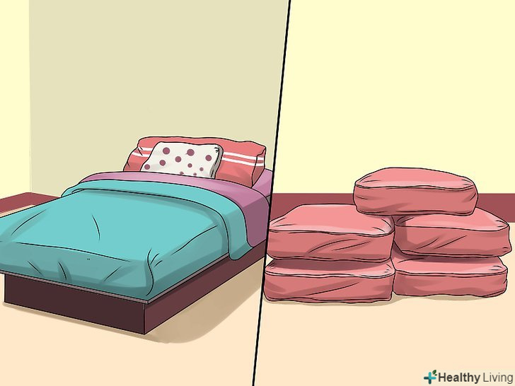 Спорудити стіни. існує два основні методи побудови стін, і вибір конкретного способу залежить від того, які подушки є у вашому розпорядженні. Почніть будівництво з ліжка, використовуючи її в якості опорної конструкції.- Метод "мішків з піском" хороший при наявності м'яких, податливих подушок. Почніть побудову з ліжка і розмістіть подушки в лінію уздовж її краю, спорудивши з них стіну необхідної довжини. Потім покладіть на нижній ряд подушок другий ряд; продовжуйте, поки не отримаєте стіну запланованої вами висоти. Не намагайтеся вибудувати занадто високу стіну, оскільки вона може обвалитися.