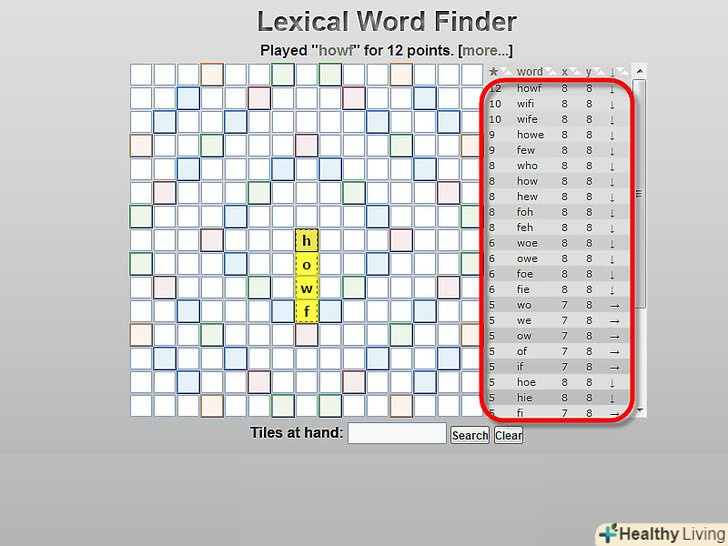 - Скористайтеся спеціальними сайтами, щоб шукати слова. є кілька сайтів для гри англійською мовою, таких як scrabblefinder.com, wordswithfriendscheat.net і lexicalwordfinder.com, які допоможуть вам автоматично підрахувати найкраще за балами слово, яким ви можете скористатися.