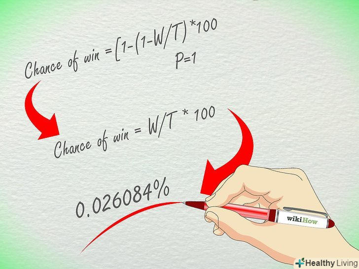 Використовуйте це рівняння: ймовірність отримання виграшного квитка = [1 - (1 - W/T)^P] * 100, де P=1. Зменшимо до: шанс на отримання виграшного квитка = W / T * 100. Одержаний результат-процентне значення, що визначає ймовірність того, що у вас виграшний квиток. Використовуйте числа з прикладу вище. Ми отримаємо ймовірність 0.026084% (менше трьох сотих відсотка).