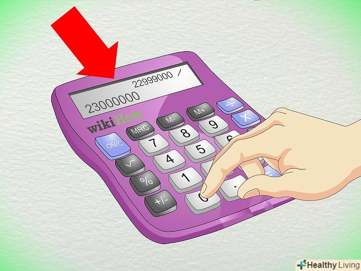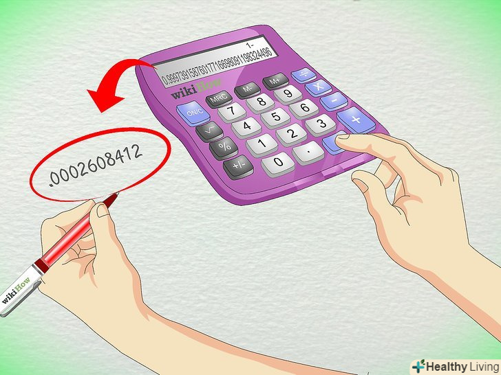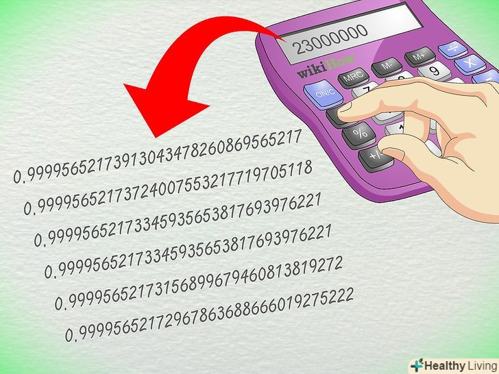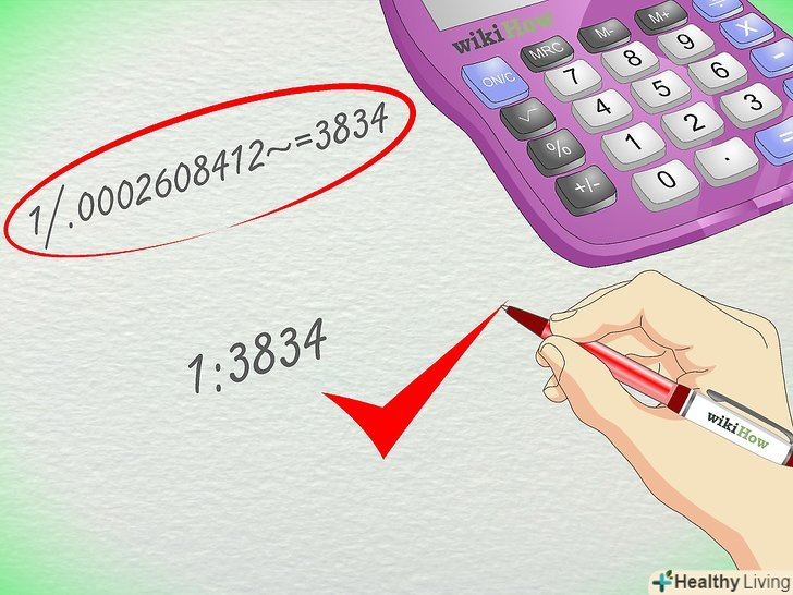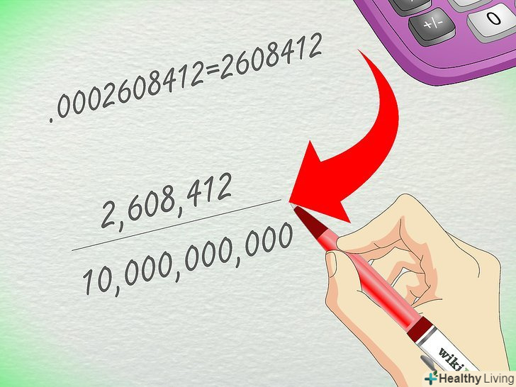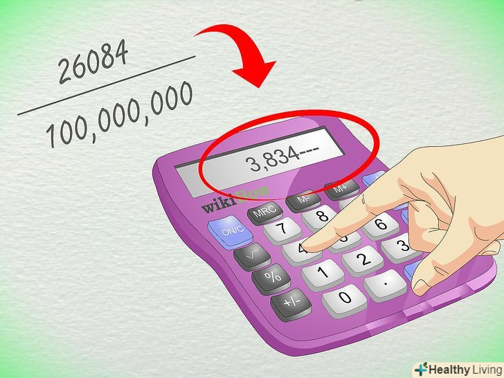 Конвертуємо в дріб. перш, ніж множити на 100, щоб отримати процентне значення, необхідно отримати 0.00026084. Створіть дріб, також, як в попередньому кроці. Використовуйте метод, описаний вище. Отримаємо 26 084/100000000 (8 нулів після одиниці тому, що в нашому числі тільки 8 символів після коми). Розділимо знаменник на чисельник. Отримаємо відповідь і округлимо його - 3834. Те ж число, що ми отримали в першому способі.