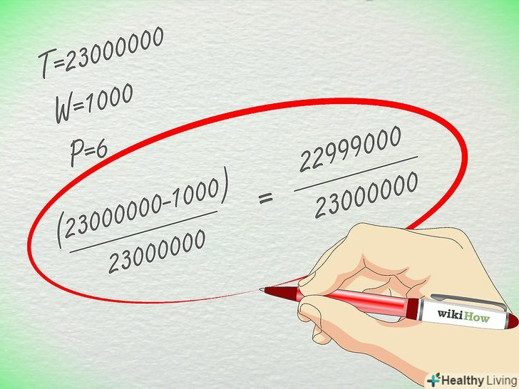 Запишіть перші дробове значення (T-W)/T. не скорочуйте значення T в дробу, поки що.- Припустимо, що лотерея продасть 23 мільйони квитків. Виграшних квитків буде 1 000. Ви плануєте купити 6 квитків. Таким чином, T = 23 000 000, W = 1000, P = 6. Перша дріб буде виглядати так: (23000000-1000) / 23000000=22999000/2300000.