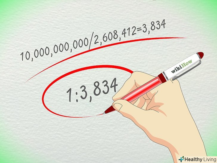 Розрахунок ймовірності. розділіть знаменник на чисельник. У нашому випадку ми ділимо 10000000000 на 2.608.412. Ми отримуємо 3884. Це означає, що у вас один шанс з 3834 на отримання виграшного квитка.