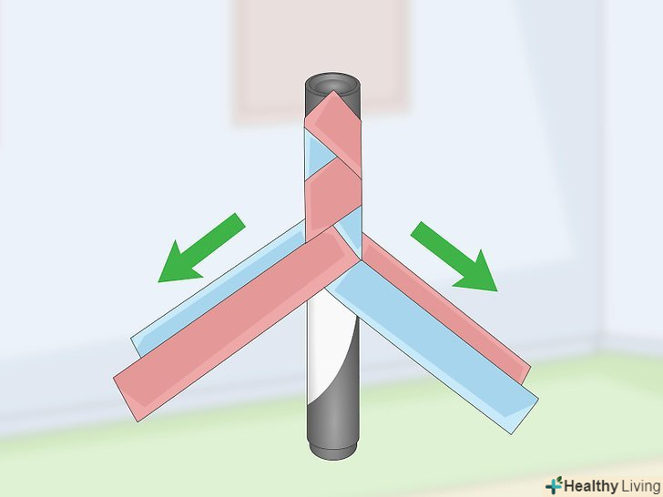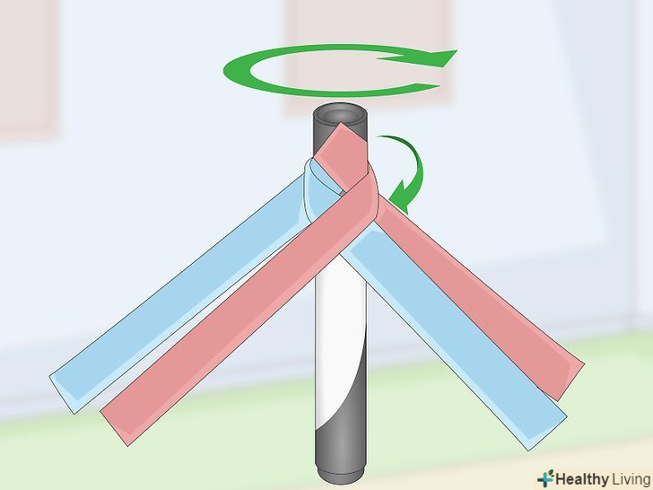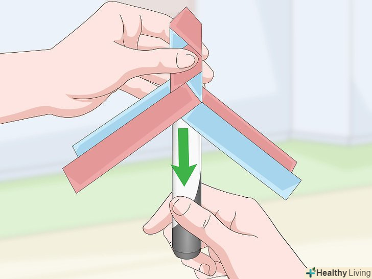 Оберніть передню праву смужку навколо задньої частини маркера. поверніть маркер так, щоб одна пара смужок виявилася попереду, а друга — ззаду нього. Загорніть праву смужку навколо маркера вправо. Пропустіть її під задньою правою смужкою. [7]- Це трохи нагадує плетіння кошика або килимка. Якщо в якийсь момент ви заплутаєтеся, просто пам'ятайте, що смужки слід протягувати одну під іншу.