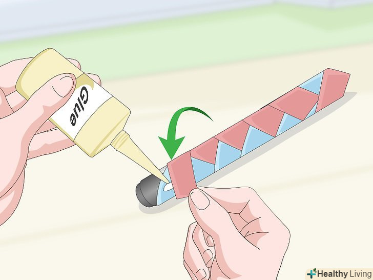 Накладіть краю смужок і склейте їх. у міру заплітання паперових смужок ви помітите, що вони стають все коротшими. Коли у вас залишиться близько 2 сантиметрів, припиніть заплітати смужки і склейте їх краю разом. Спочатку склейте дві смужки на передній, а потім пару смужок на задній частині маркера. [12]- Можна використовувати гарячий клей, клей ПВА або клеїть олівець.
